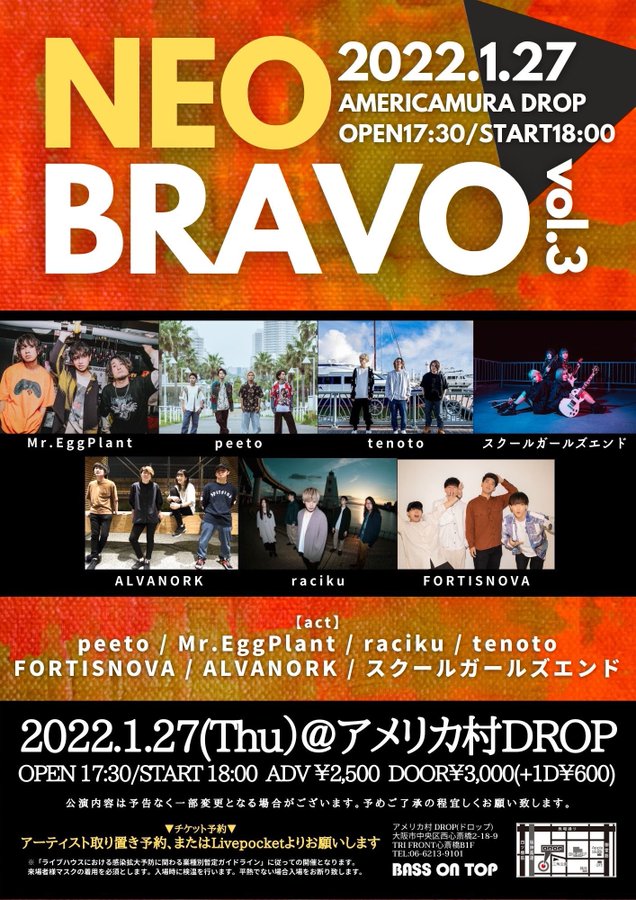 2021年12月02日 【ライブ情報】1/27(木)@アメリカ村DROP NEO BRAVO Vol.03 【1月大阪解禁!】▼2022.01.27(木)NEO BRAVO Vol.03[会場]アメリカ村DROP[開場/開演]17:30/18:00[前売]¥2,500(1D別)peetoMr.EggPlantracikutenotoFORTISNOVAALVANORKスクールガールズエンドLivepockethttps://t.livepocket.jp/e/neob03 チケット予約http://raciku.com/ticket/ 「近畿」カテゴリの最新記事 < 前の記事次の記事 >