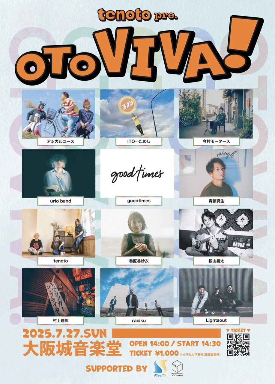 2025年04月21日 【ライブ情報解禁!!】7/27 『tenoto presents 【OTOVIVA!】』 [ 会場 ] 大阪城音楽堂[ 開場 / 開演 ] 14:00/14:30[ チケット代 ] ¥1,000※小学生以下無料(保護者同伴) 《チケット購入はこちら!》※TIGETのみでの一括受付となります。 ACT.racikutenotogoodtimesアシガルユースLightsouturio band齊藤真生松山晃太(BYEE the ROUND,GRAND FAMILY ORCHESTRA)村上達郎番匠谷紗衣今村モータースITO→たのし カテゴリなしの他の記事 < 前の記事次の記事 >